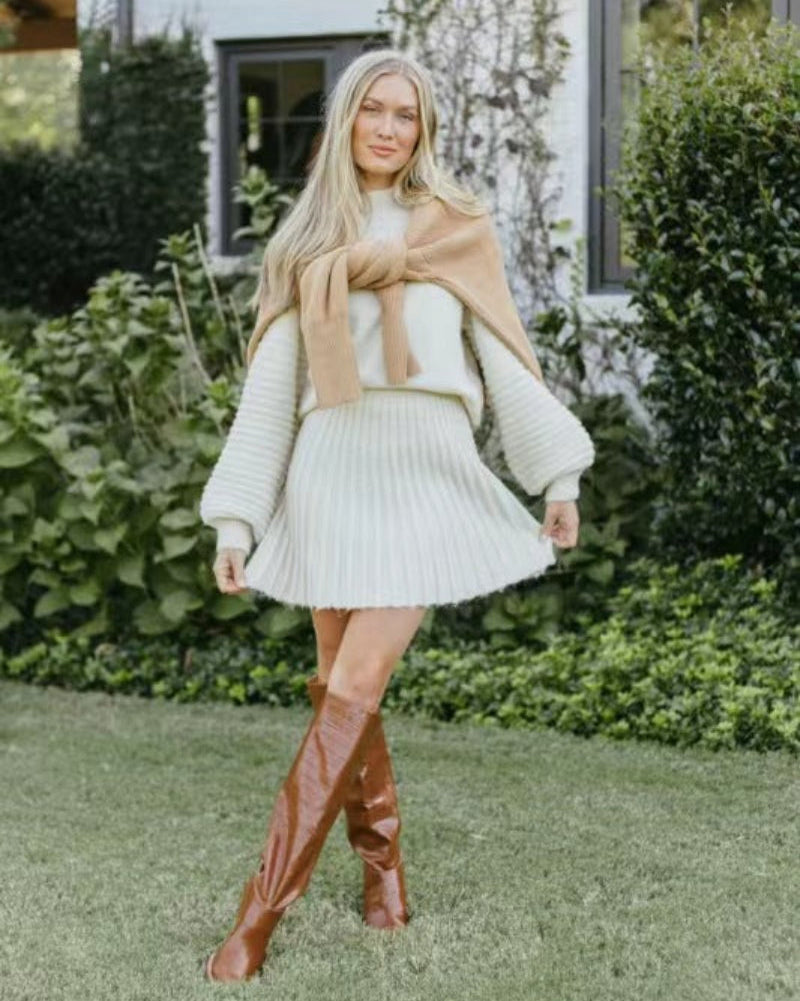 Features: The high-neck, long-sleeve knit sweater offers a snug yet breathable fit, perfect for staying warm in chilly weather. Women sweater sets with this chic high-waisted skirt featuring playful accordion pleats. The A-line silhouette flatters every body type, and the mini length adds a youthful, trendy vibe to your outfit